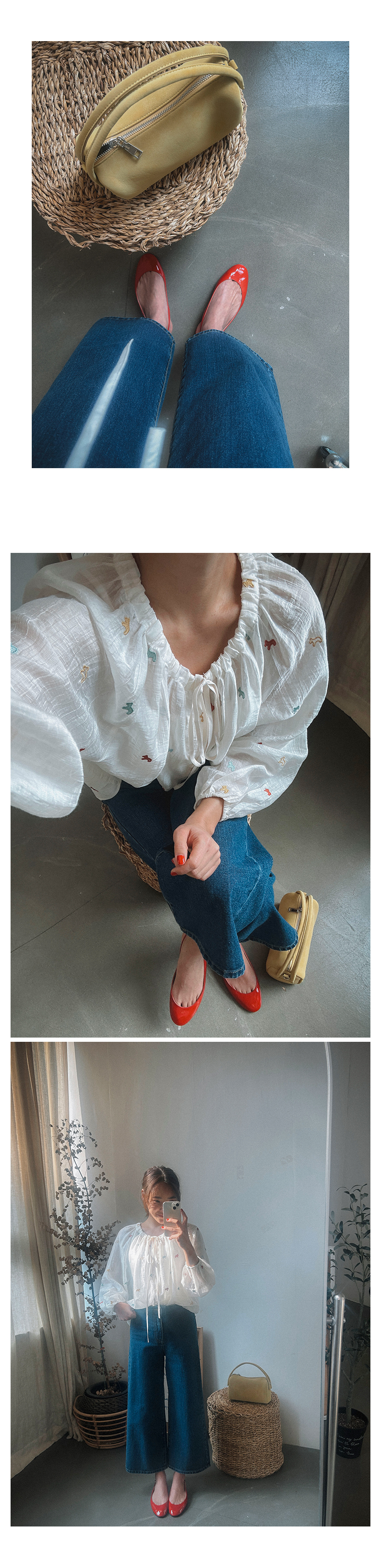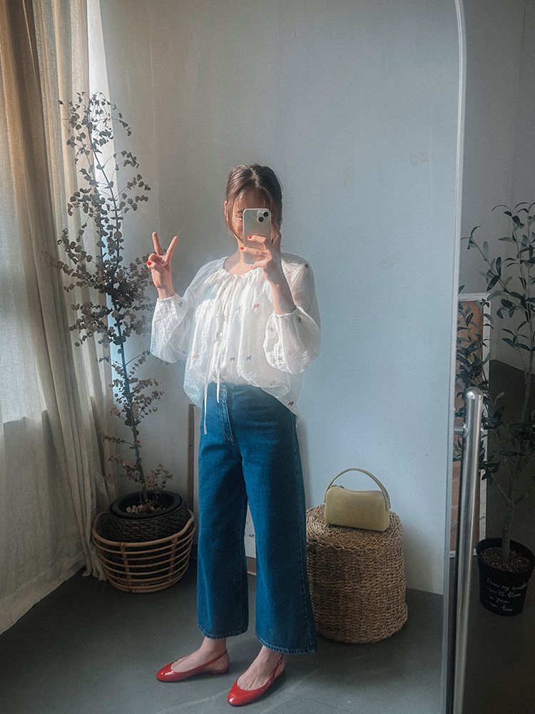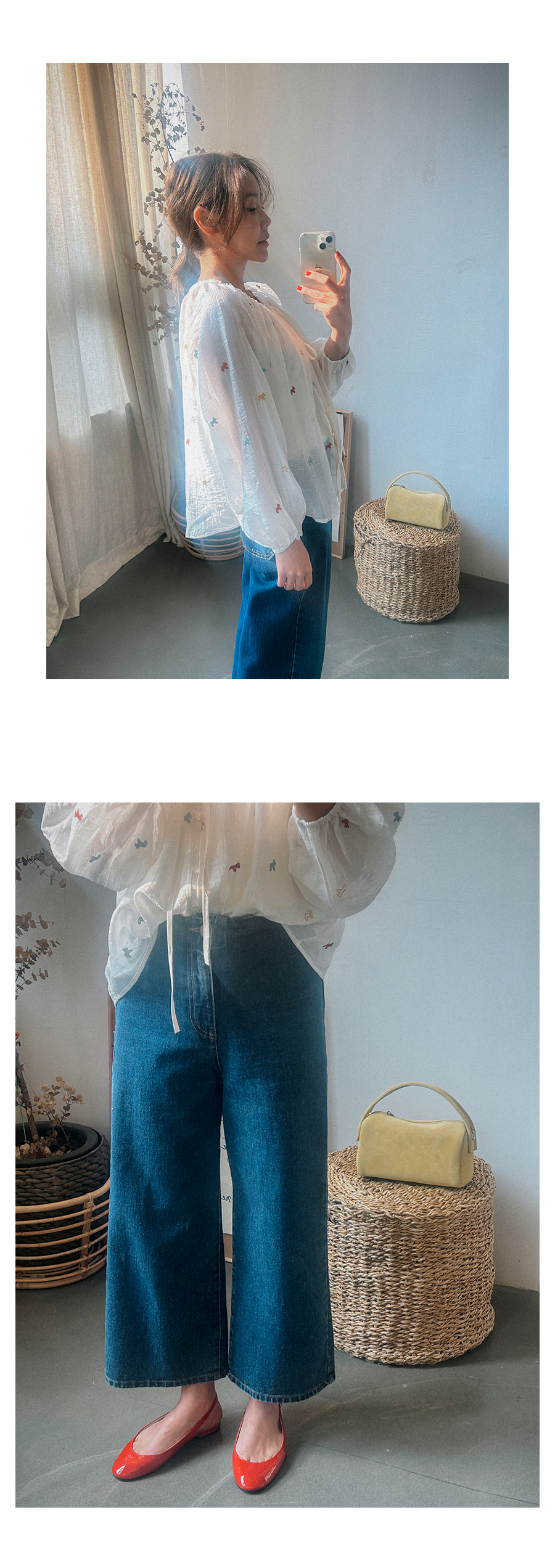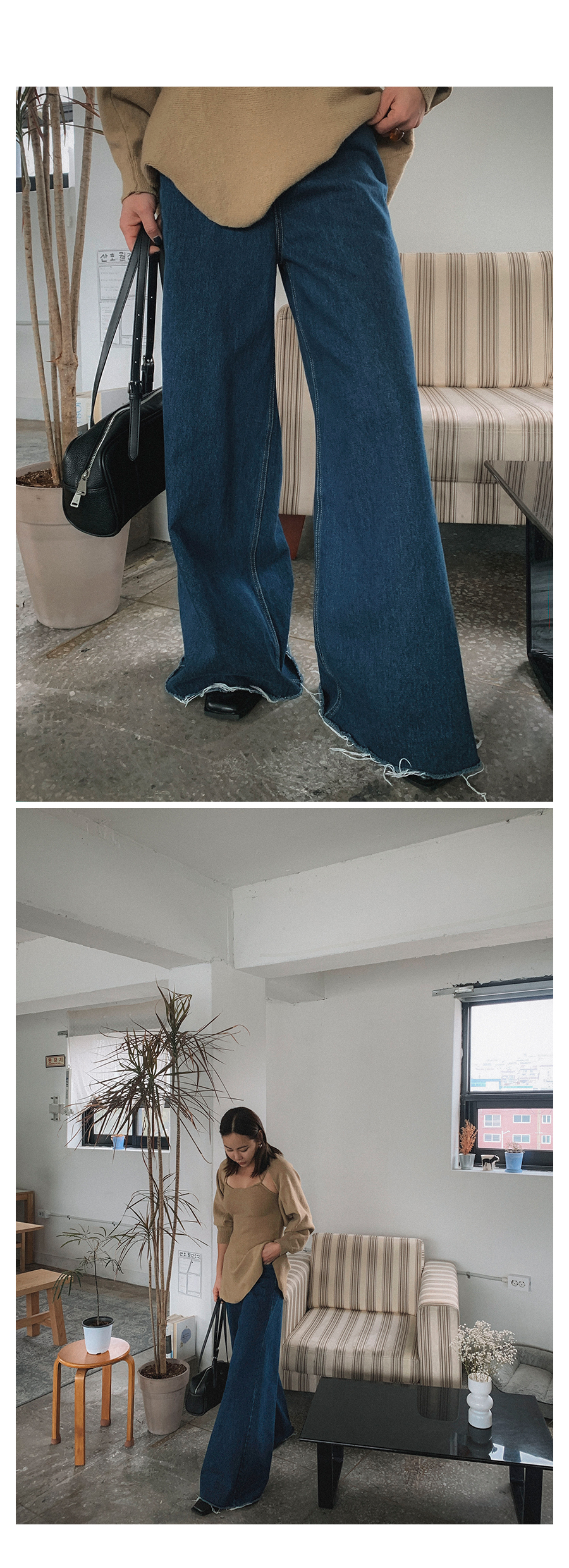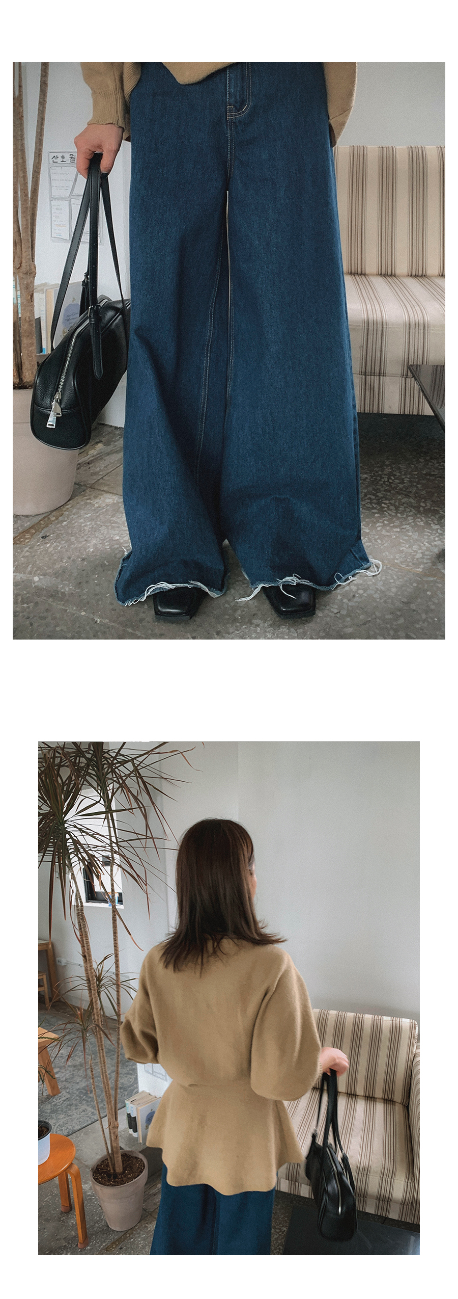 - 데님 소재 및 컬러감이 강한 의류의경우 밝은 소재(의류,가방,슈즈)와 함께 착용시 이염 가능성이 있을 수 있으니 주의하여 주세요.