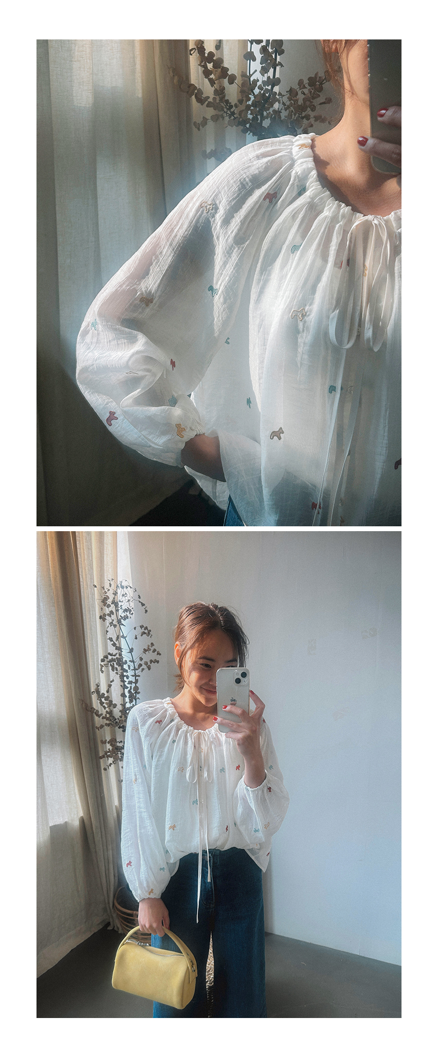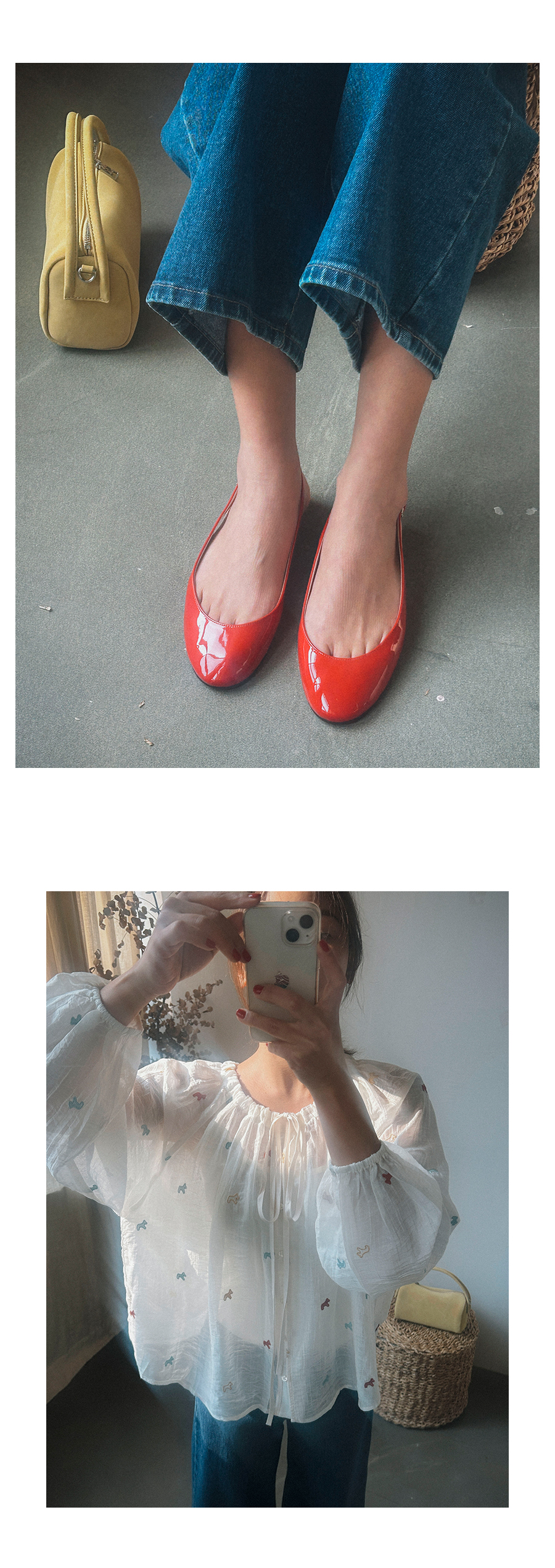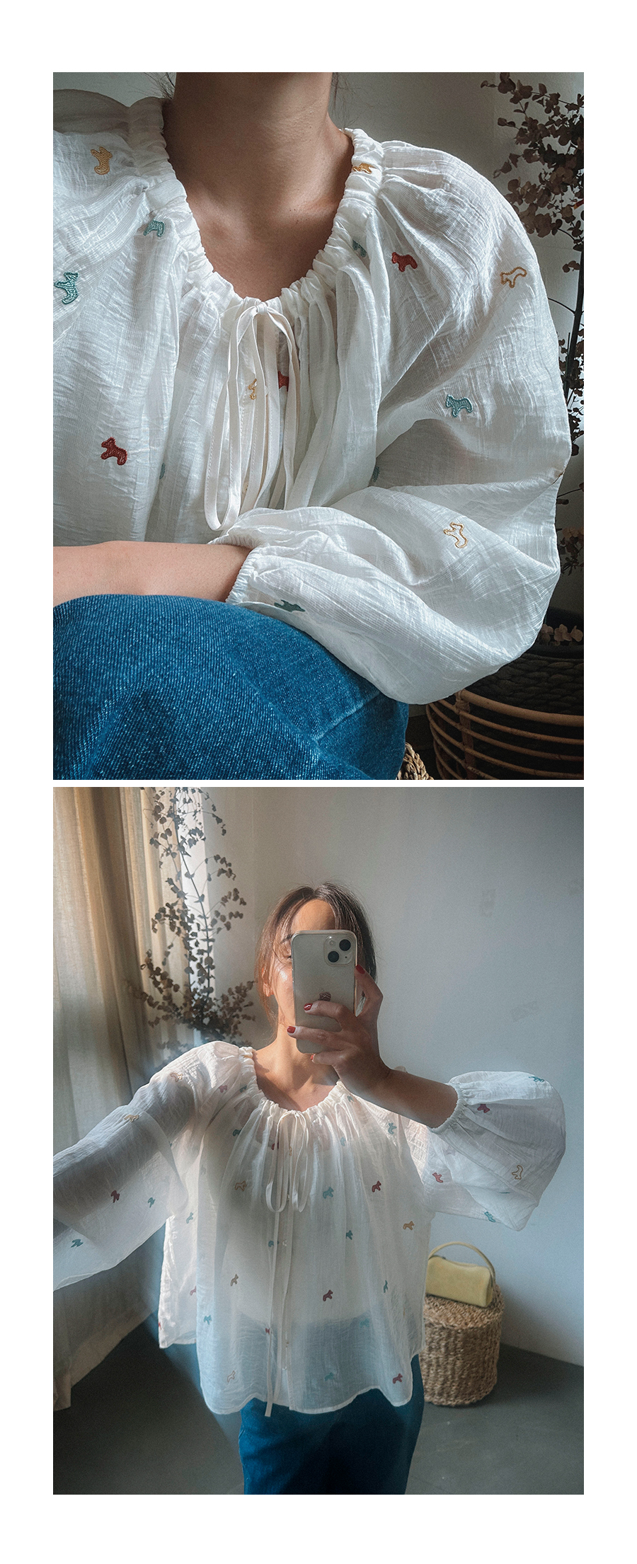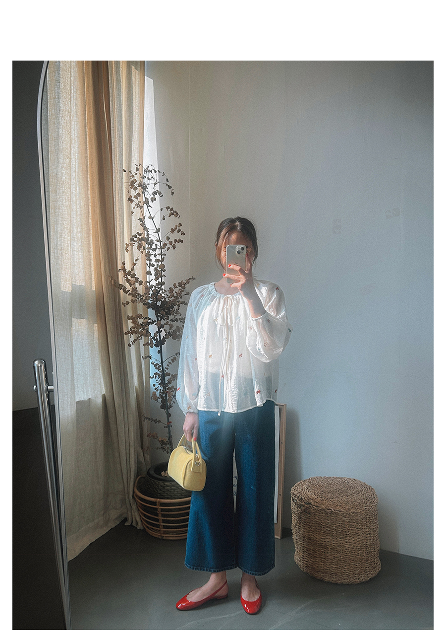 - 데님 소재 및 컬러감이 강한 의류의경우 밝은 소재(의류,가방,슈즈)와 함께 착용시 이염 가능성이 있을 수 있으니 주의하여 주세요.