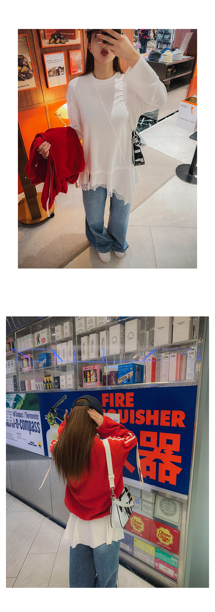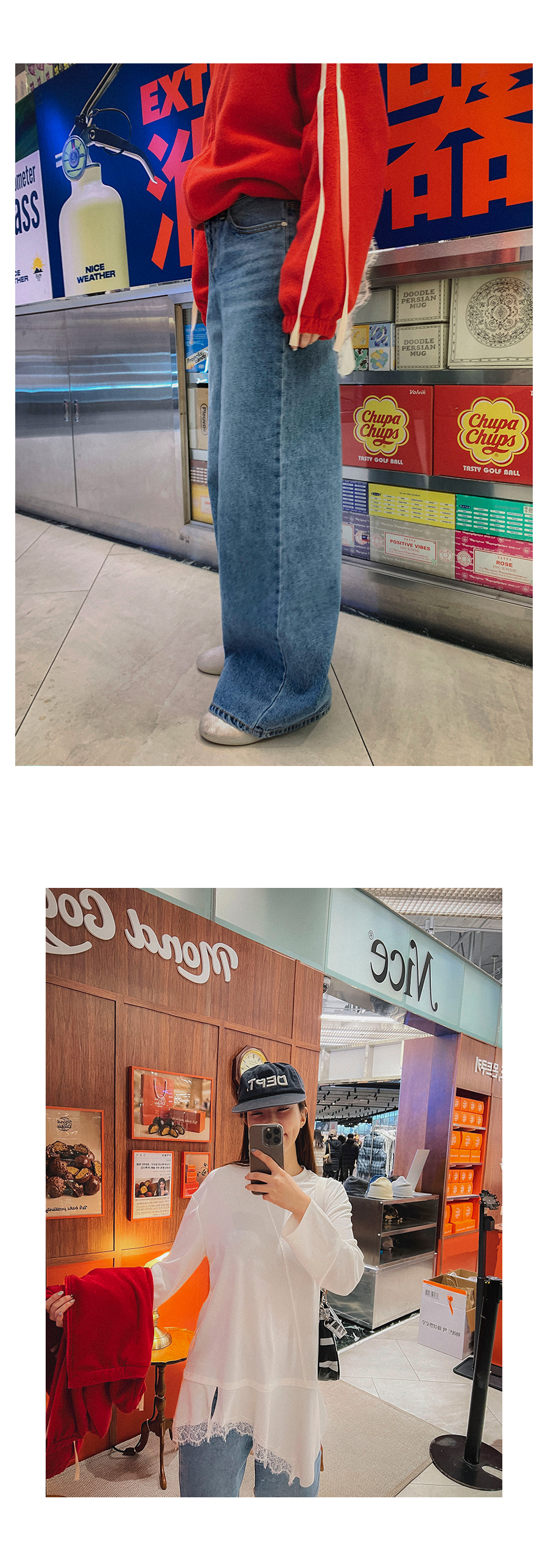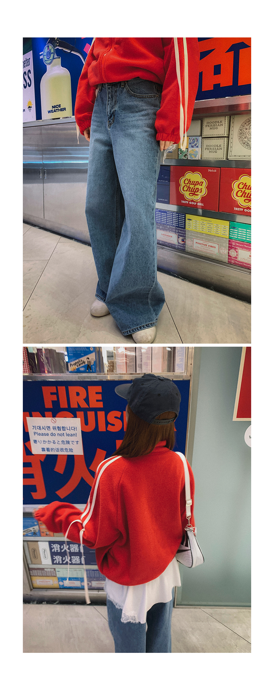 - 데님 소재 및 컬러감이 강한 의류의경우 밝은 소재(의류,가방,슈즈)와 함께 착용시 이염 가능성이 있을 수 있으니 주의하여 주세요.