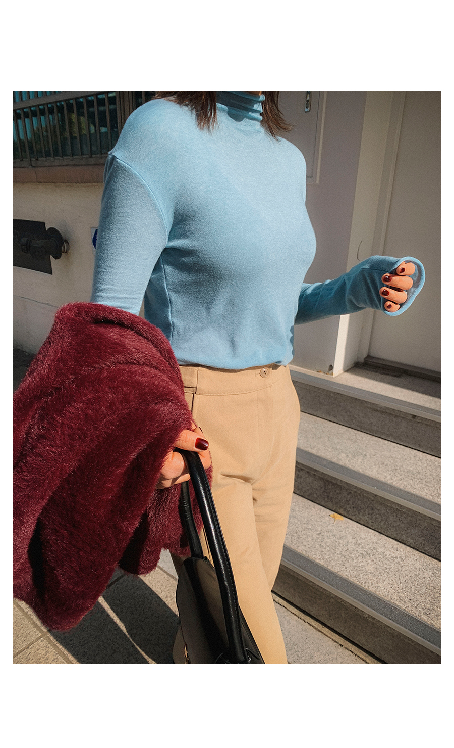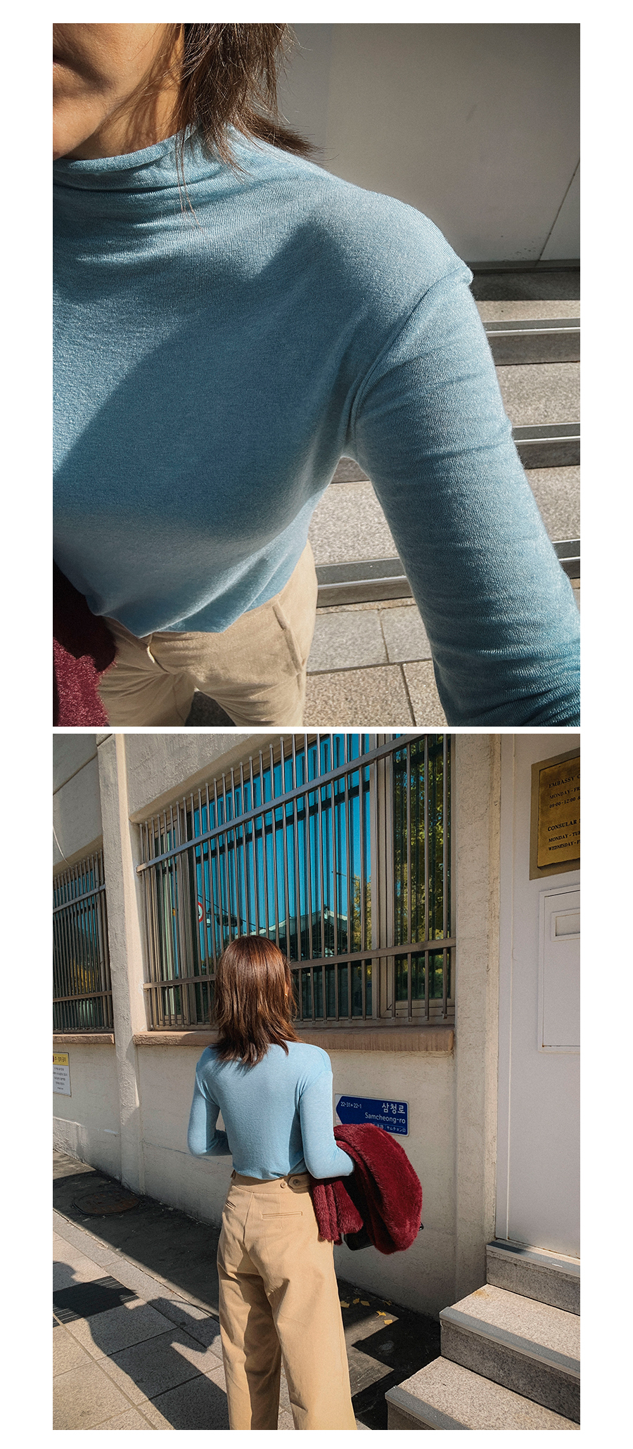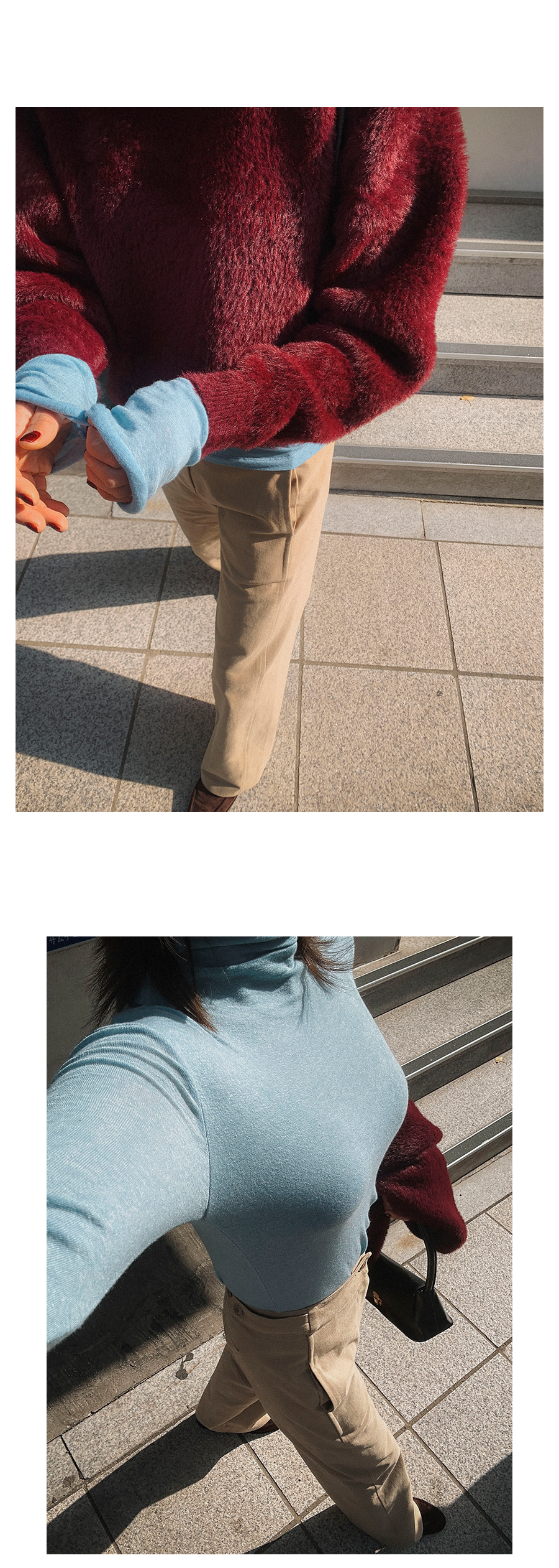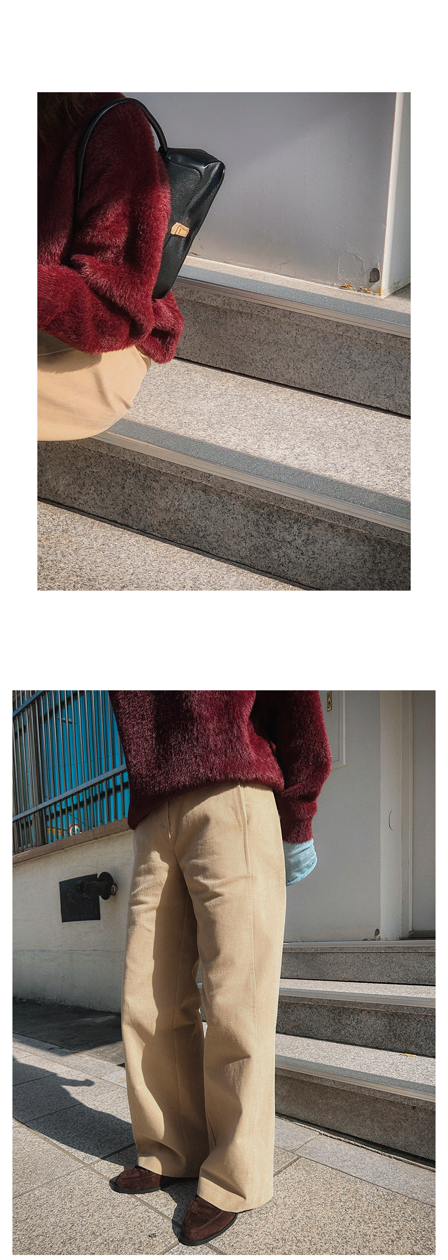 - 데님 소재 및 컬러감이 강한 의류의경우 밝은 소재(의류,가방,슈즈)와 함께 착용시 이염 가능성이 있을 수 있으니 주의하여 주세요.