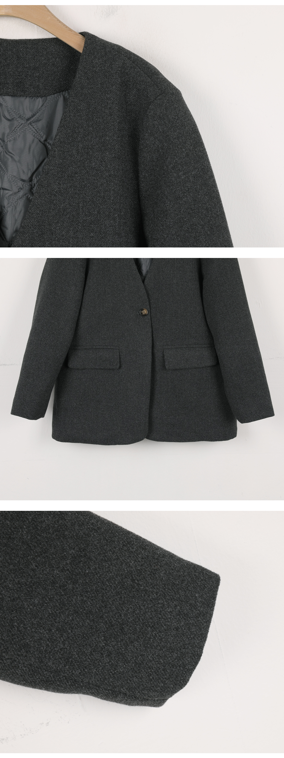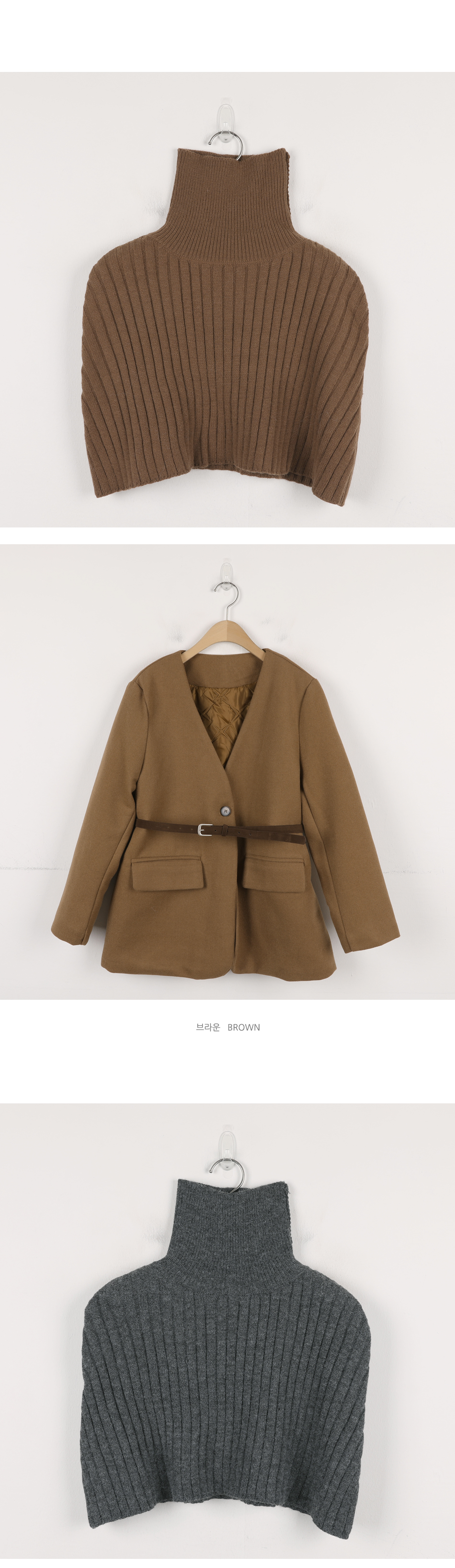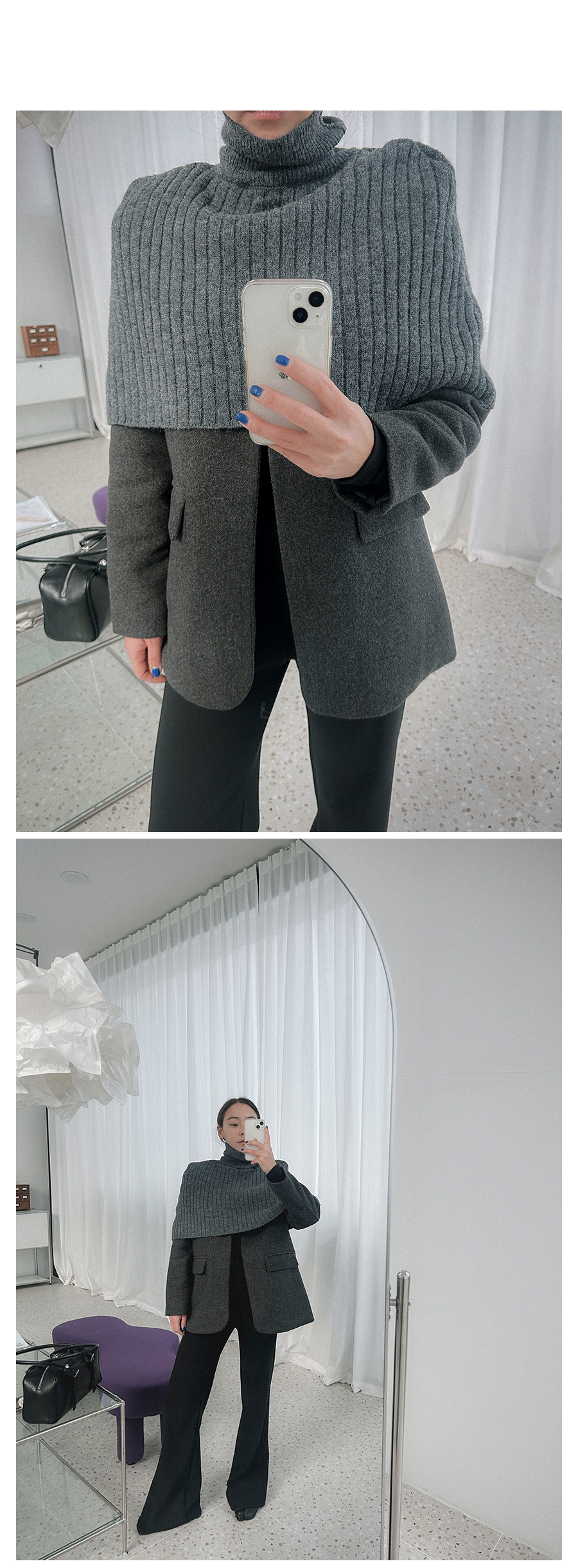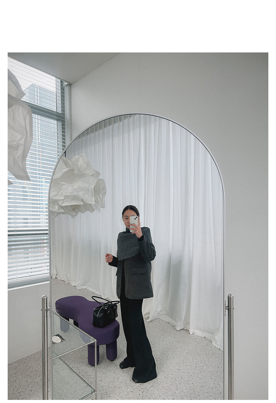 비침 X l 신축성 X(케이프O) l 두께감 △ l 안감 X(자켓O) l 광택 X