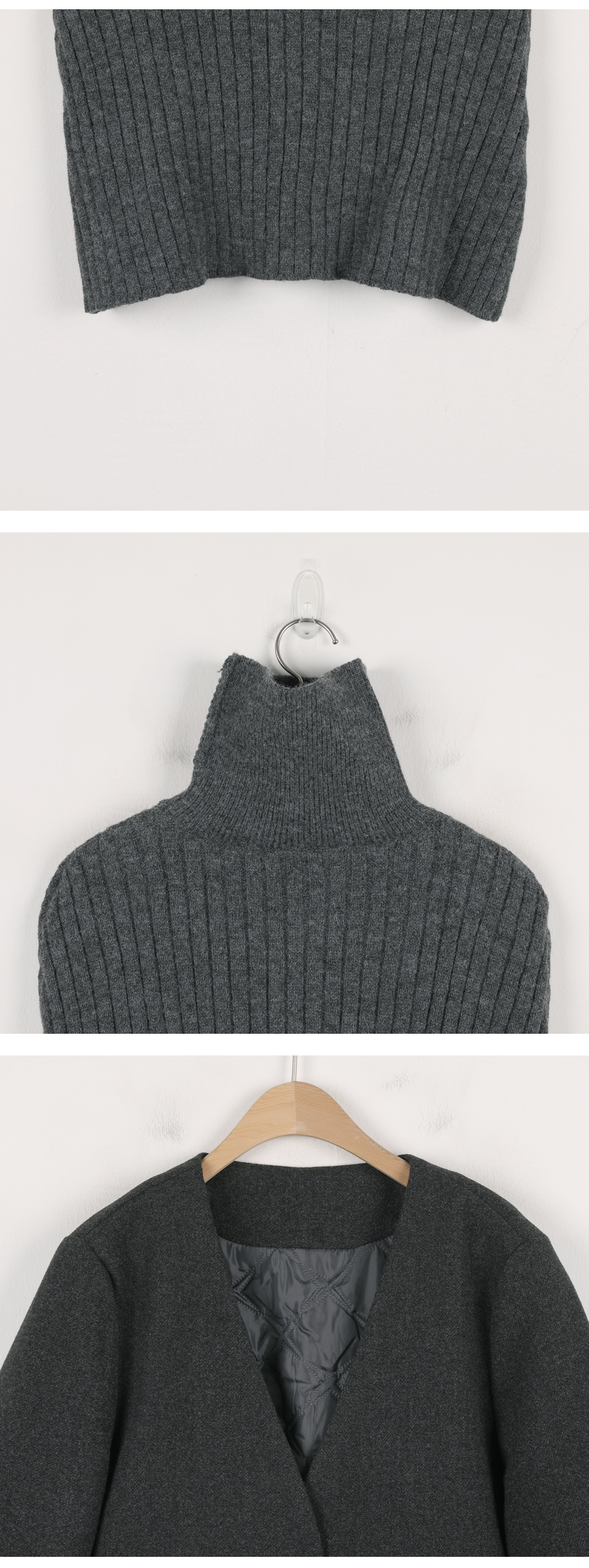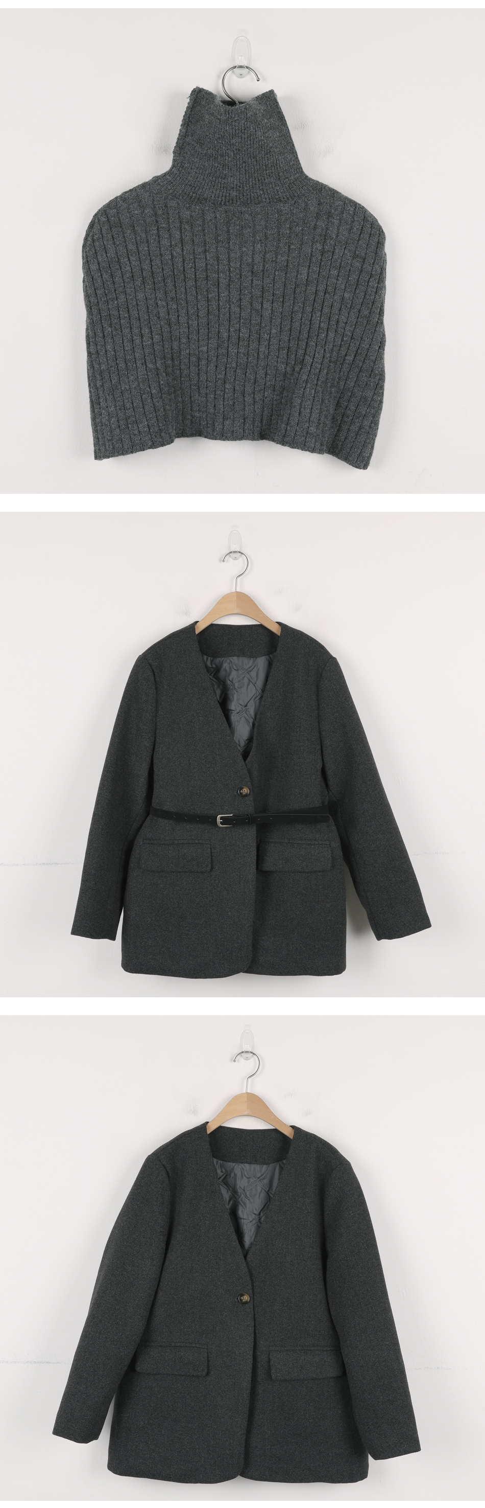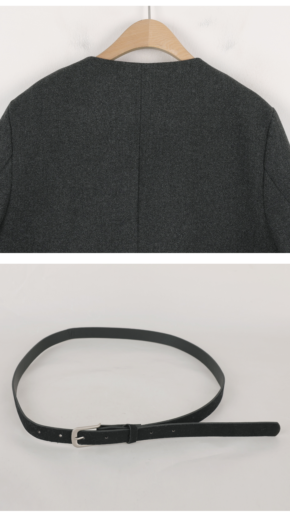 비침 X l 신축성 X(케이프O) l 두께감 △ l 안감 X(자켓O) l 광택 X