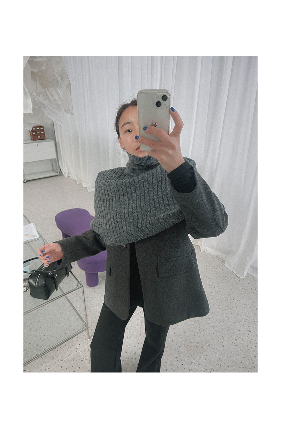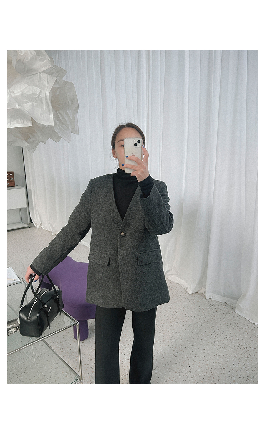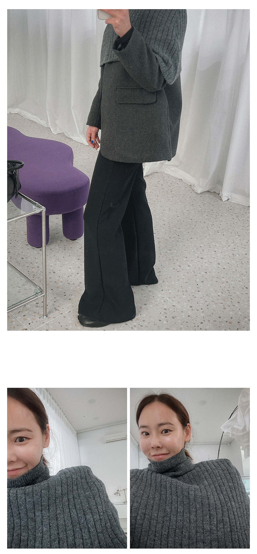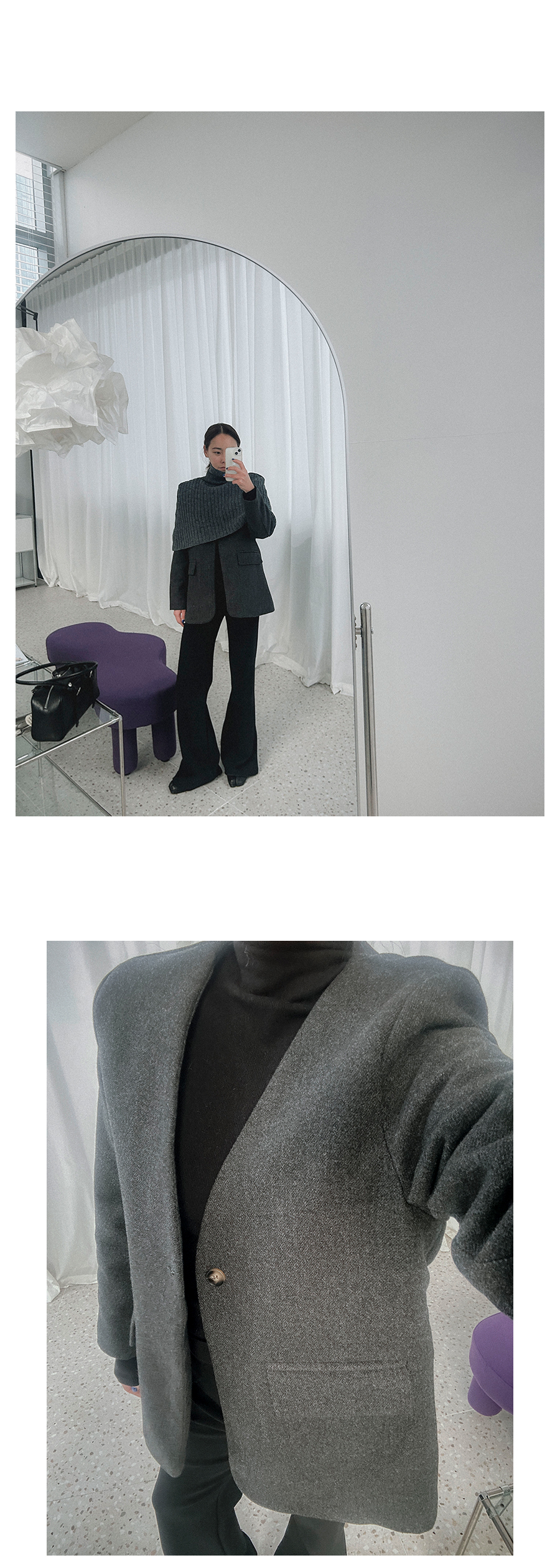 비침 X l 신축성 X(케이프O) l 두께감 △ l 안감 X(자켓O) l 광택 X