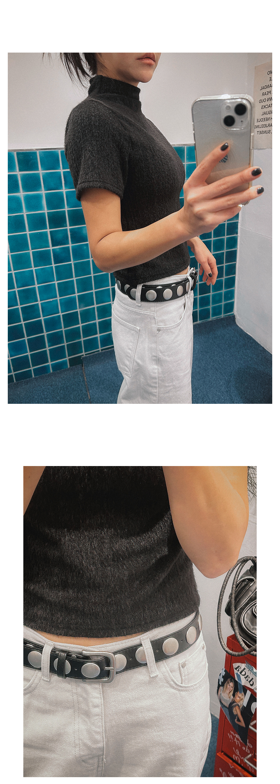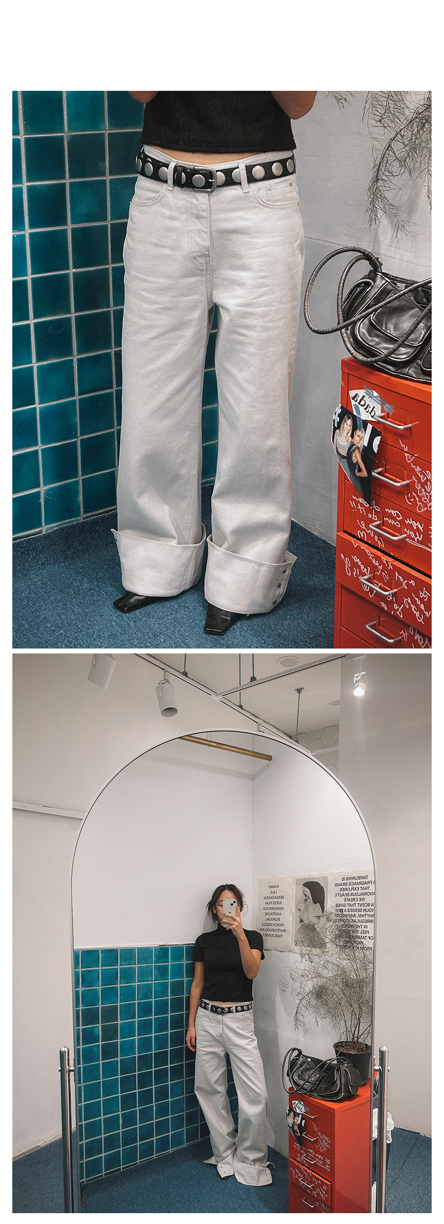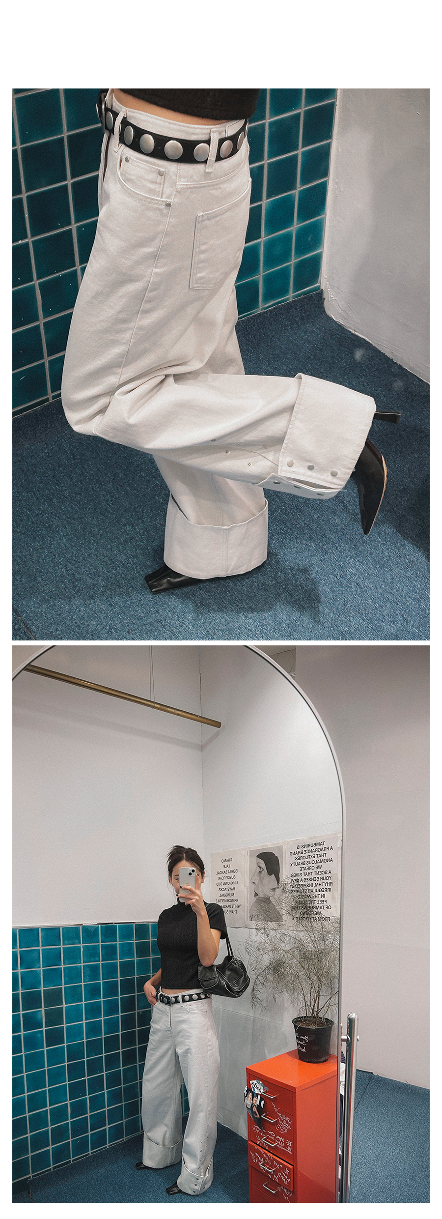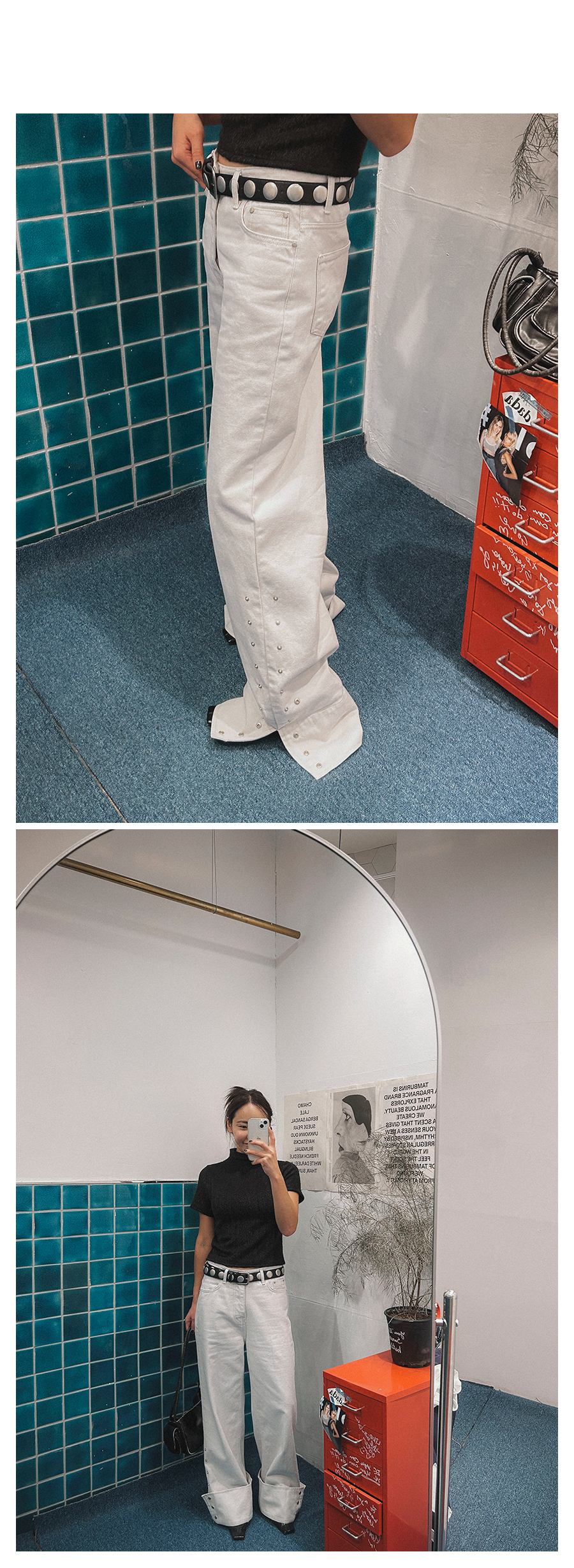 - 데님 소재 및 컬러감이 강한 의류의경우 밝은 소재(의류,가방,슈즈)와 함께 착용시 이염 가능성이 있을 수 있으니 주의하여 주세요.