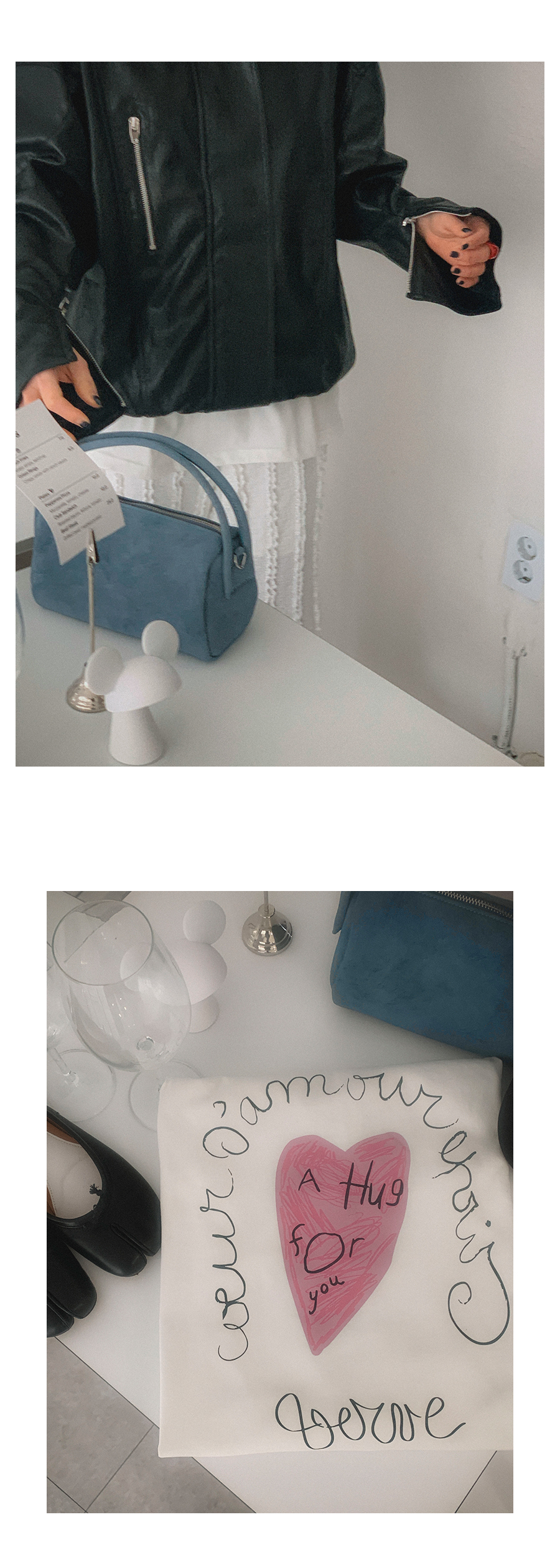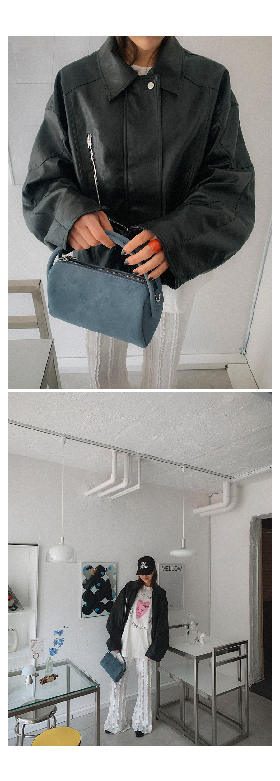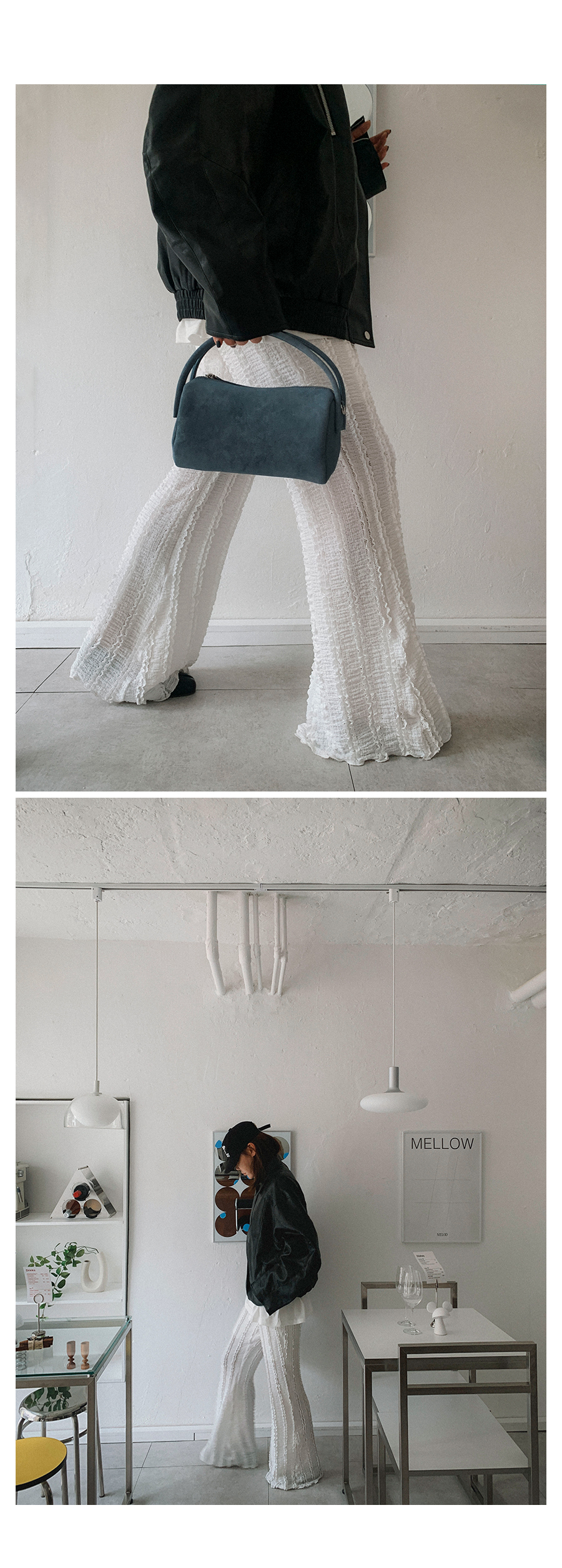 - 데님 소재 및 컬러감이 강한 의류의경우 밝은 소재(의류,가방,슈즈)와 함께 착용시 이염 가능성이 있을 수 있으니 주의하여 주세요.